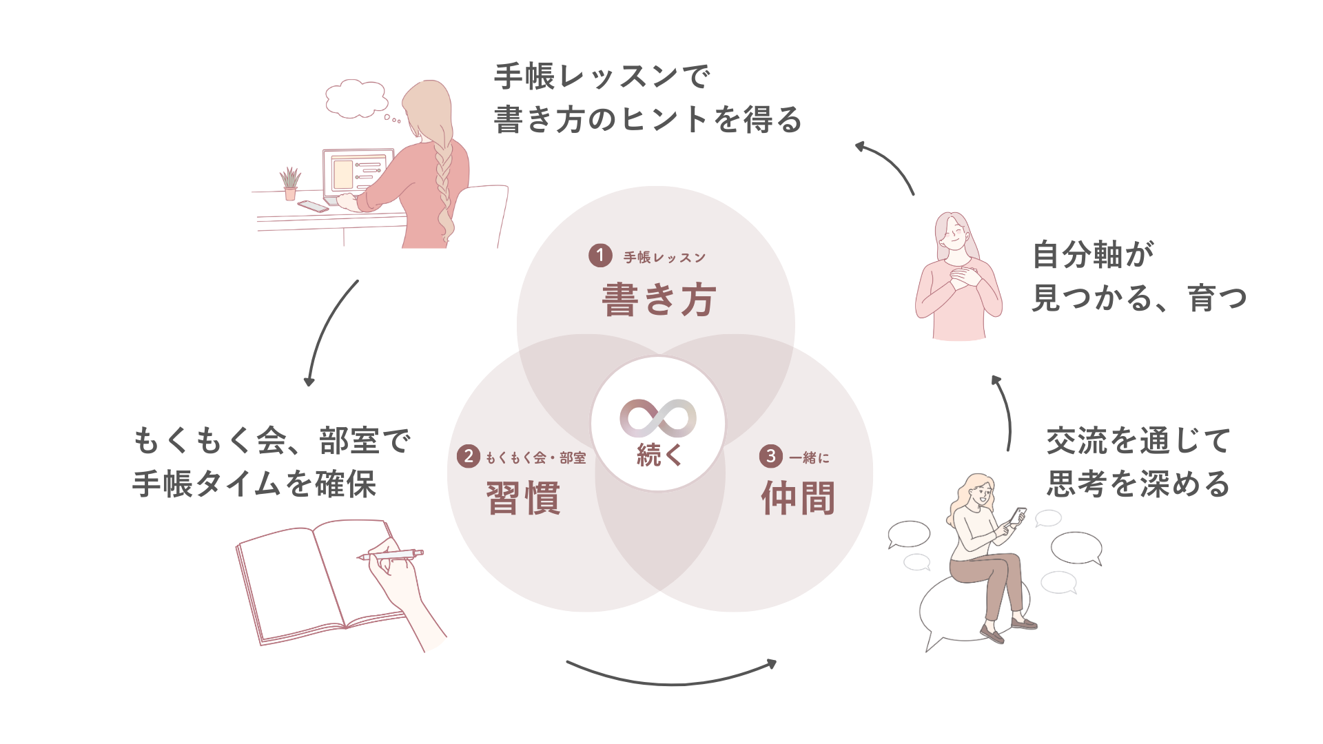 仲間と情報交換し合ったり、一緒に手帳を書く時間を過ごしたり、オンラインイベントに参加したり、自分軸手帳をフル活用するためにコミュニティです。