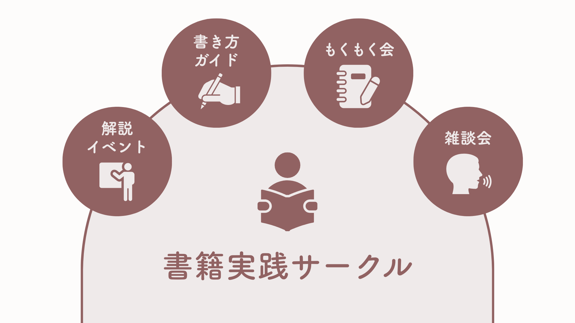 書籍に収録されているワークを一人ではやりきる自信がない、読んだだけで終わってしまう。そんな方におすすめなのが書籍実践サークル。書籍の学びを手帳を通じて、仲間と一緒に実践していきます。