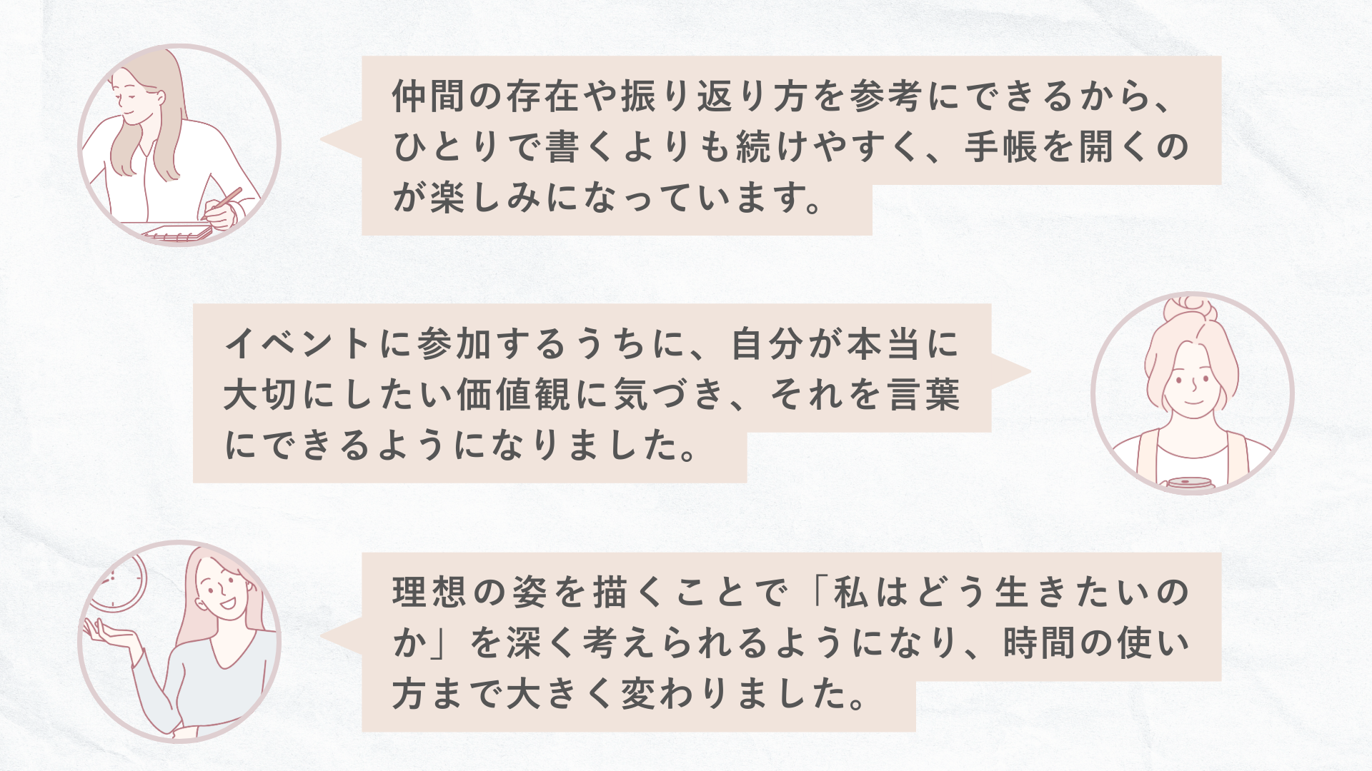 これまでご参加いただいた方も、自分軸手帳部に参加して、はじめて手帳が続いたというお声をたくさんいただいております。