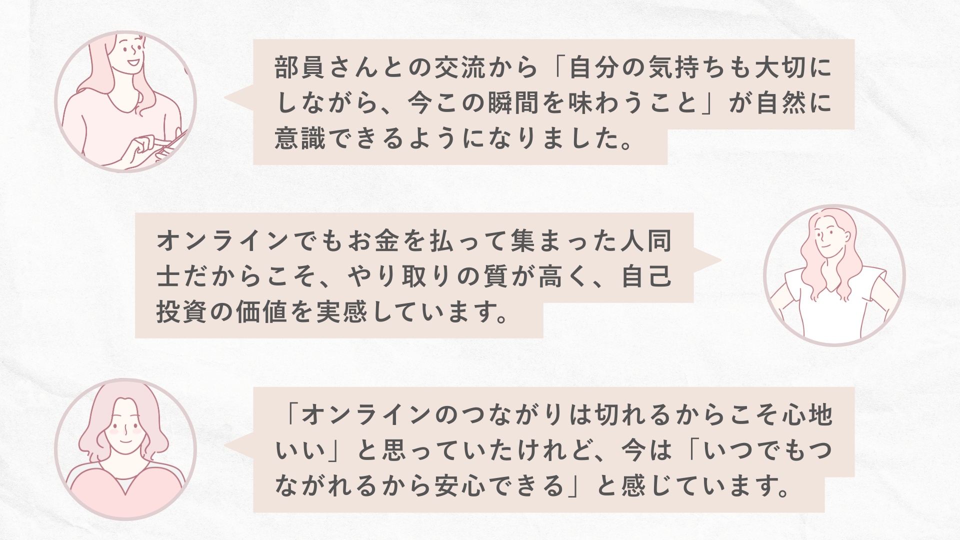 自分軸手帳部は自分にとって心地よいスタイルで手帳継続を楽しめる安心・安全な場。一人では続かなかった手帳が、手帳部で仲間と一緒に取り組んだらはじめて続いた、あやふやだった自分軸が見えてきた、夢がかなった!という声もたくさん。