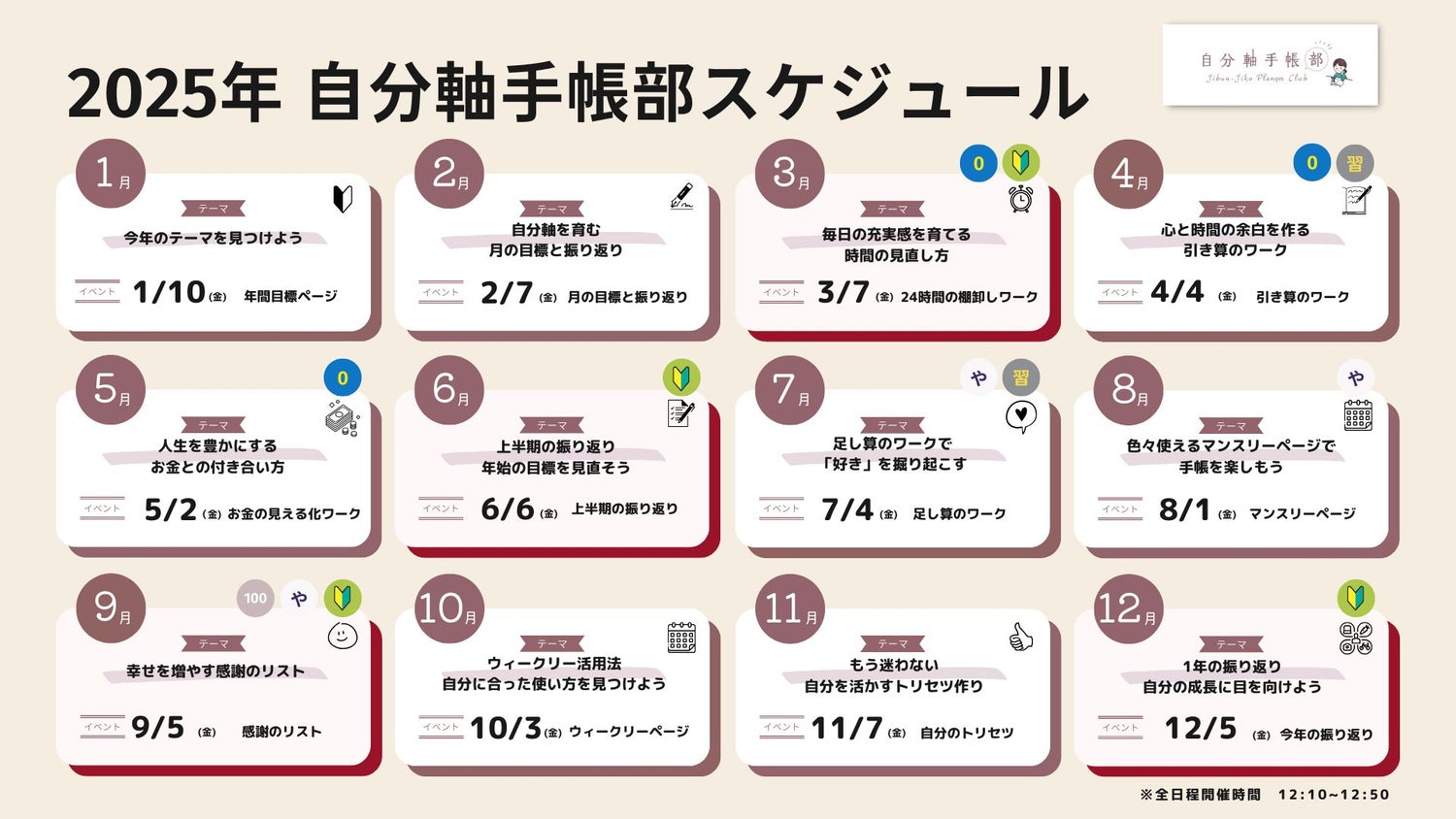 自分軸手帳部では、1か月ごとに手帳のワークに沿ったテーマをご用意しています。1年を通して自分軸手帳部に参加することで、時間、お金など様々な角度から自分と向き合い、手帳を通じて自分軸を見つけて育てることができます。